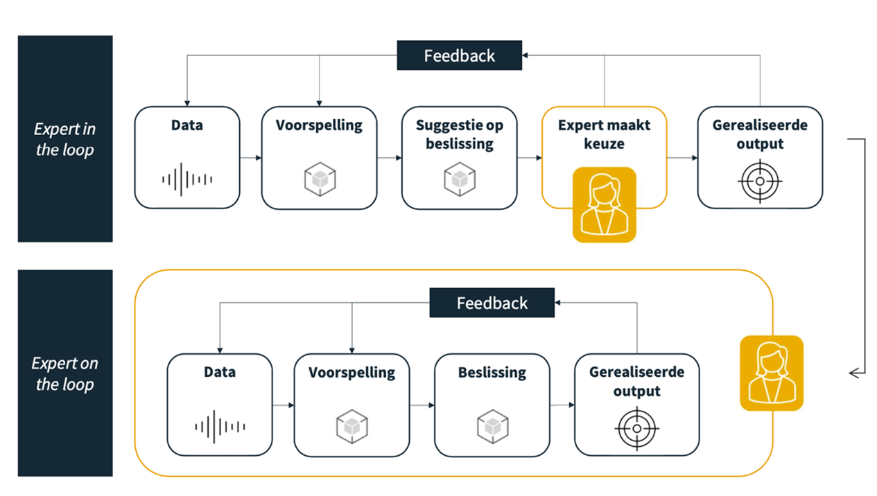 In eerste instantie draait het AI-model mee met productie en geeft het advies aan de operator en als er dan vertrouwen ontstaat kan het AI-model steeds meer zelf gaan doen. Onderstaande afbeelding geeft dit verschil weer tussen de Expert-in-the-loop en de Expert-on-the-loop.