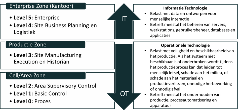Begin met het OT-landschap: Welke systemen genereren welke data stromen? Voor welk systeem is een bepaalde data stroom relevant? Hoe gaan de data stromen over de verschillende lagen heen? Vanwege de cybersecurity is het af te raden dat data direct door alle lagen kan. De OT-data zal vandaar gebufferd of geconverteerd worden richting IT en vice versa. Daarnaast speelt systeembeschikbaarheid ook mee: kan de productie doorgaan als er tijdelijk geen data uit ERP of MES komt? Al deze vragen komen samen in een gebruikersspecificatie, high level design en IT-architectuur ontwerp. Als dit ontwerp eenduidig is, zal het ook veel makkelijker zijn om de cybersecurity goed te integreren (secure by design).